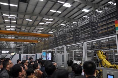 在本次大會安排的現(xiàn)場參觀環(huán)節(jié),廣日股份位于番禺區(qū)的廣日工業(yè)園與廣汽集團化龍生產(chǎn)基地一起作為工業(yè)機器人應(yīng)用示范企業(yè)接待了參會領(lǐng)導(dǎo)、一百余人的參觀訪問。廣日股份作為廣州先進制造企業(yè)的代表,自2008以廣日工業(yè)園建設(shè)為契機積極實施技術(shù)升級改造項目,開始大規(guī)模的采用自動化、智能化設(shè)備替代傳統(tǒng)設(shè)備,引進、改造了電梯鈑金柔性生產(chǎn)線,高速自動導(dǎo)軌生產(chǎn)線,自動搬運、焊接機器人,自動化配送系統(tǒng)等,極大的提升了生產(chǎn)效率,提高制造質(zhì)量,減少人力,并通過CRM、PDM、SCM、ERP、LDS、EDS、MES等信息化系統(tǒng)的陸續(xù)上線、整合,逐步搭建起了公司管理、研發(fā)、業(yè)務(wù)、生產(chǎn)、物流、服務(wù)一體化的信息化平臺,業(yè)務(wù)流程信息化覆蓋率95%,推動公司智能化、數(shù)字化生產(chǎn)的不斷前進,結(jié)合公司當前正在實施以及規(guī)劃中的一系列制造升級改造項目,將進一步夯實“智能制造”的基礎(chǔ),向“制造智能”發(fā)展。