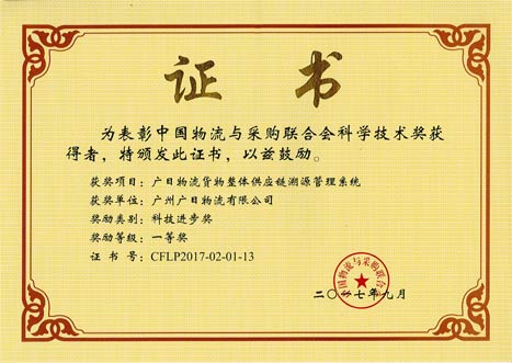 ? ? ? ? 近日,由中國(guó)物流與采購(gòu)聯(lián)合會(huì)主辦的“第十屆現(xiàn)代物流科技創(chuàng)新大會(huì)暨2017年度中國(guó)物流與采購(gòu)聯(lián)合會(huì)科學(xué)技術(shù)獎(jiǎng)?lì)C獎(jiǎng)大會(huì)”在江蘇南京召開(kāi),公司下屬控股子公司廣日物流憑借自主創(chuàng)新研發(fā)的 “貨物整體供應(yīng)鏈溯源管理系統(tǒng)”榮獲科技進(jìn)步獎(jiǎng)一等獎(jiǎng)。